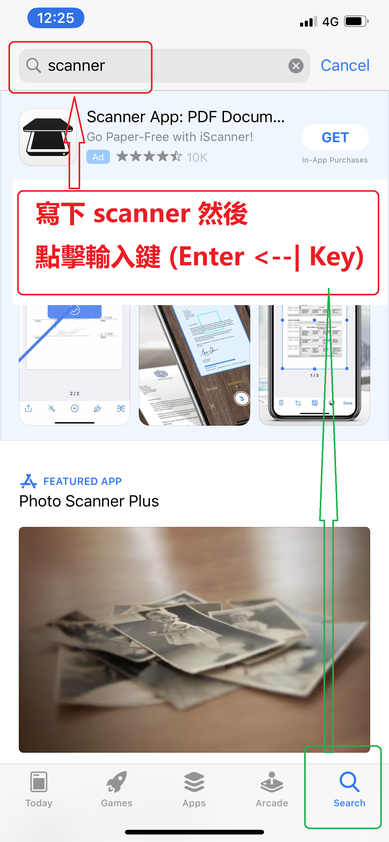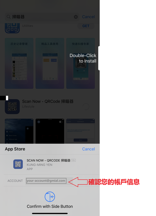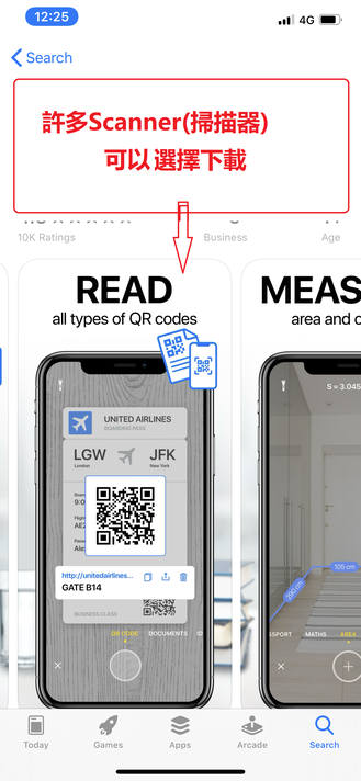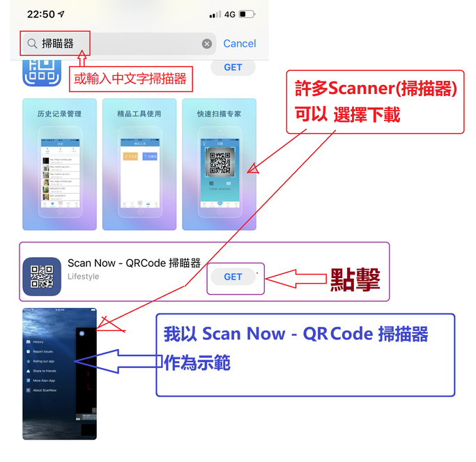 我以 「Scan Now - QRCode 掃描器」作為示範。找到後點擊 GET