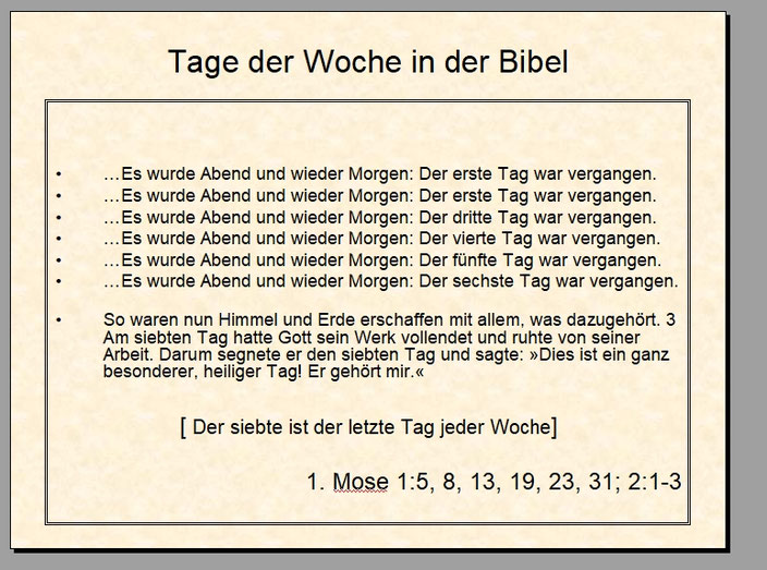 2.2/3 Am siebten Tag hatte Gott sein Werk vollendet und ruhte von seiner Arbeit. Darum segnete er den siebten Tag und sagte: »Dies ist ein ganz besonderer, heiliger Tag! Er gehört mir.«