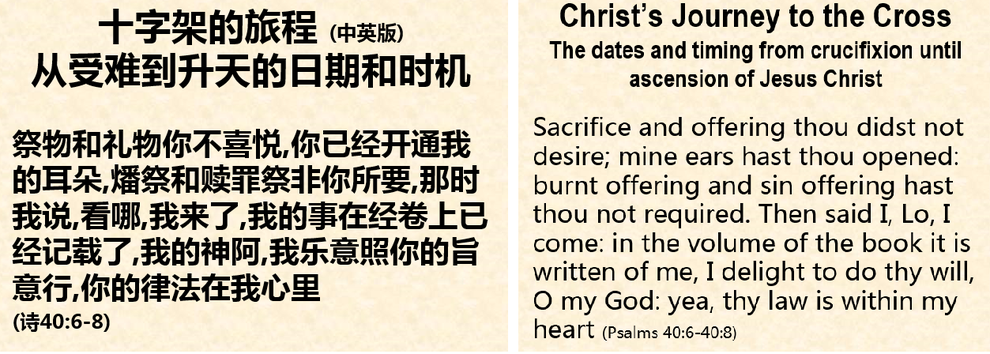 聖經裡有關「十字架旅程的重要记事」。請特别注意主耶穌受難安葬的有關經節:馬太27:57-66;馬可15:42-16:1;路加23:44-56;約翰19:31-42。