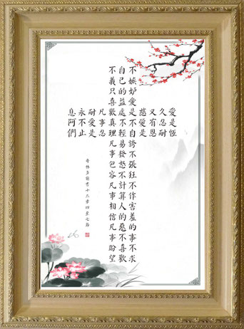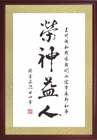 家中懸掛福音字畫, 可以提醒我們要感謝主耶穌的厚愛宏恩, 時刻不忘榮神益人。弟兄姊妹結婚, 送福音字畫作賀禮就最好了, 可營造基督化家庭。特色是可給你加上下款, 即是收禮者及送贈者姓名, 令雙方都有個紀念。 除了是字畫, 亦可變身為鏡子, 美化家居。